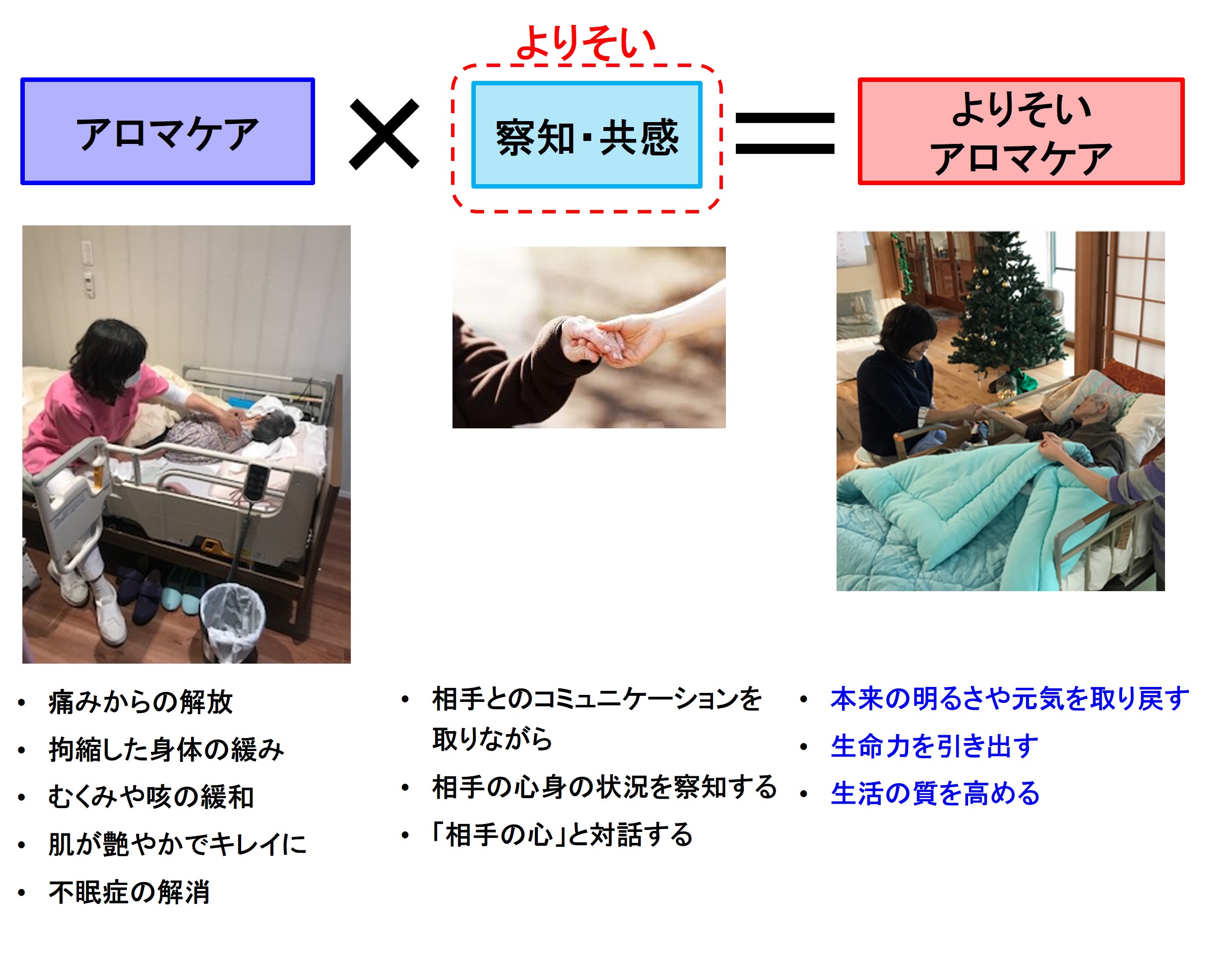 よりそいアロマケアとは、 “ケアする相手に寄り添い、相手の心身の状況を察知し、相手の心と対話する”というスタイルをプラスしたアロマケアです。
